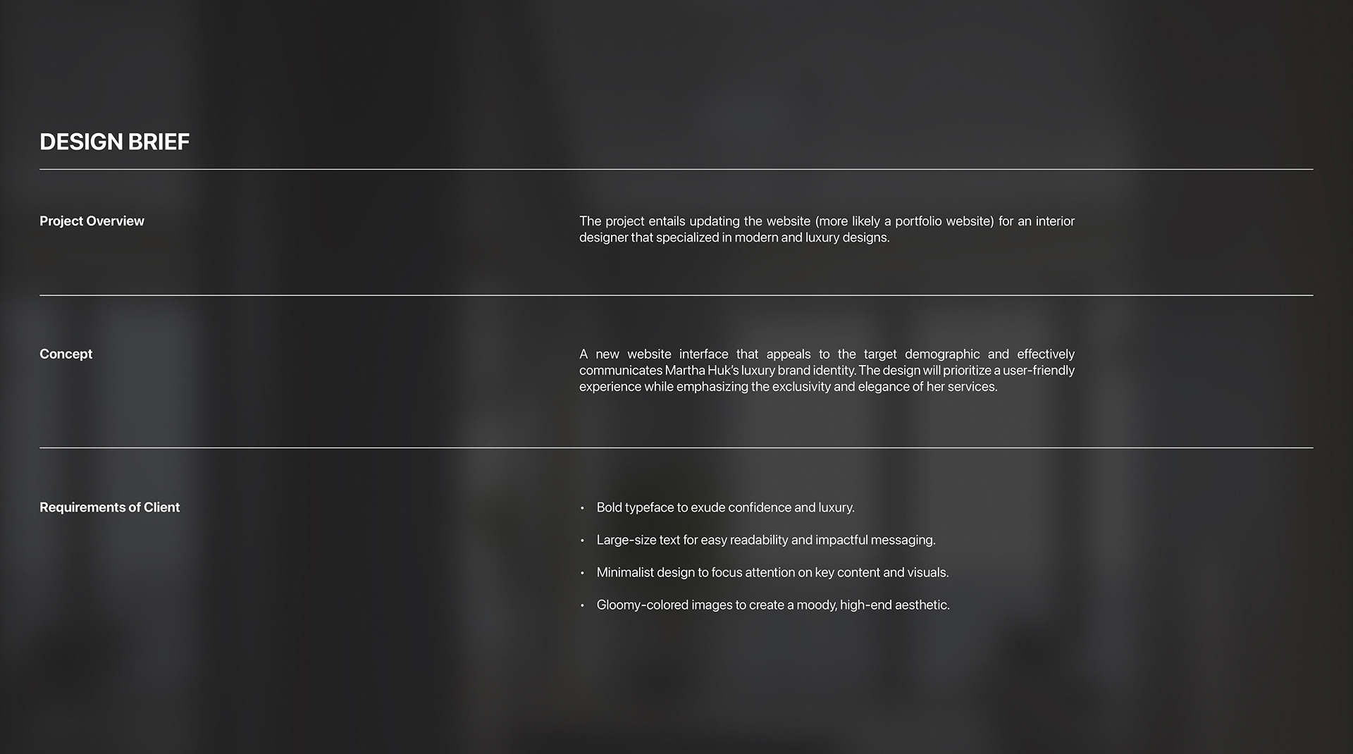 A new website interface that appeals to the target demographic and effectively communicates Martha Huk’s luxury brand identity. The design will prioritize a user-friendly experience while emphasizing the exclusivity and elegance of her services.