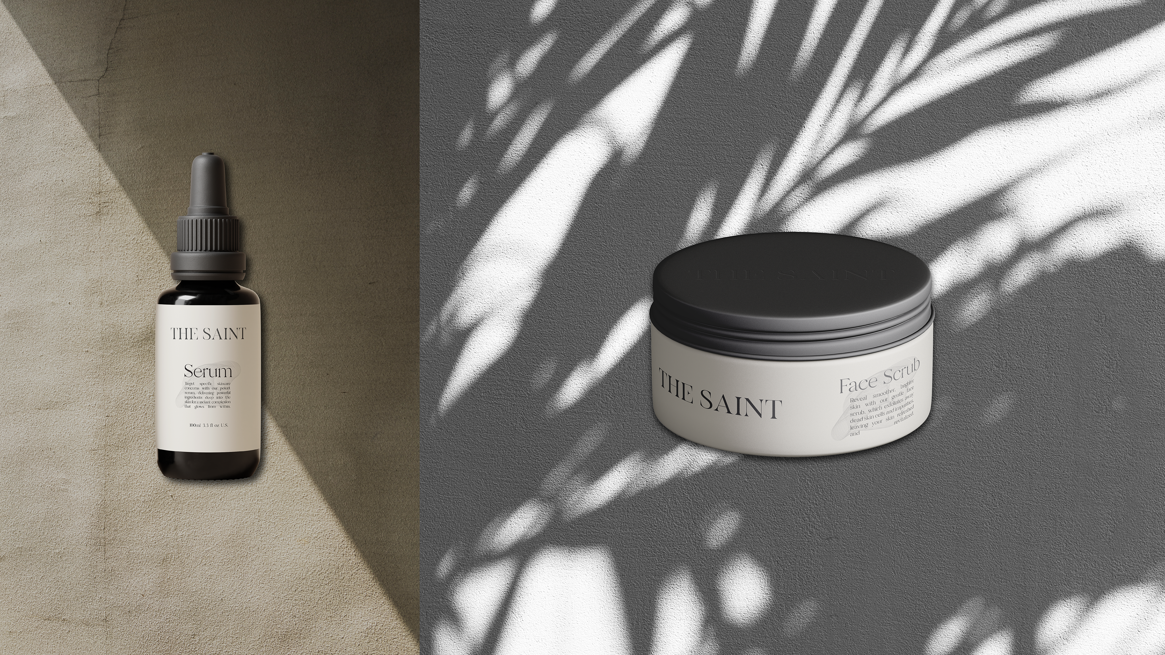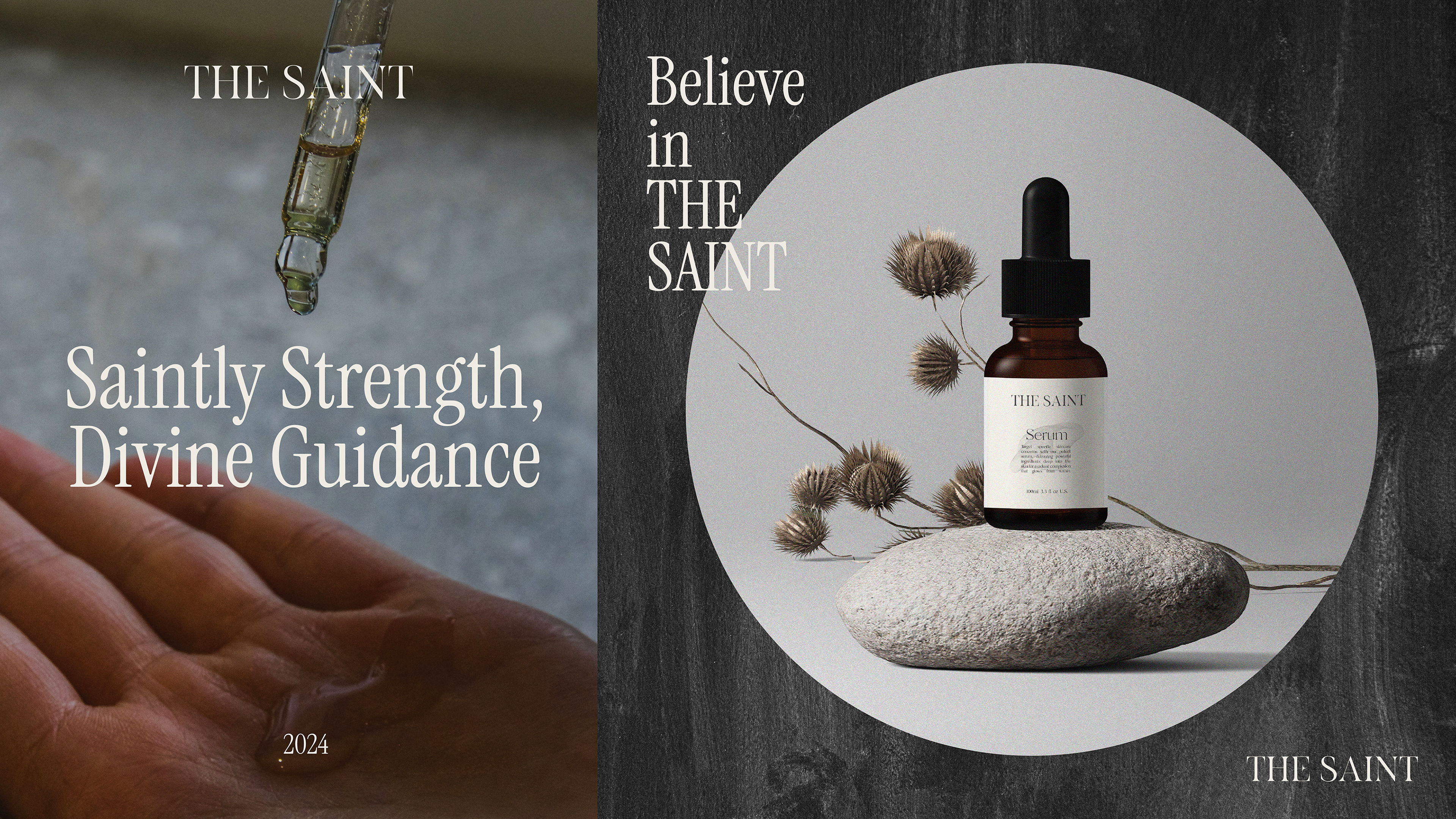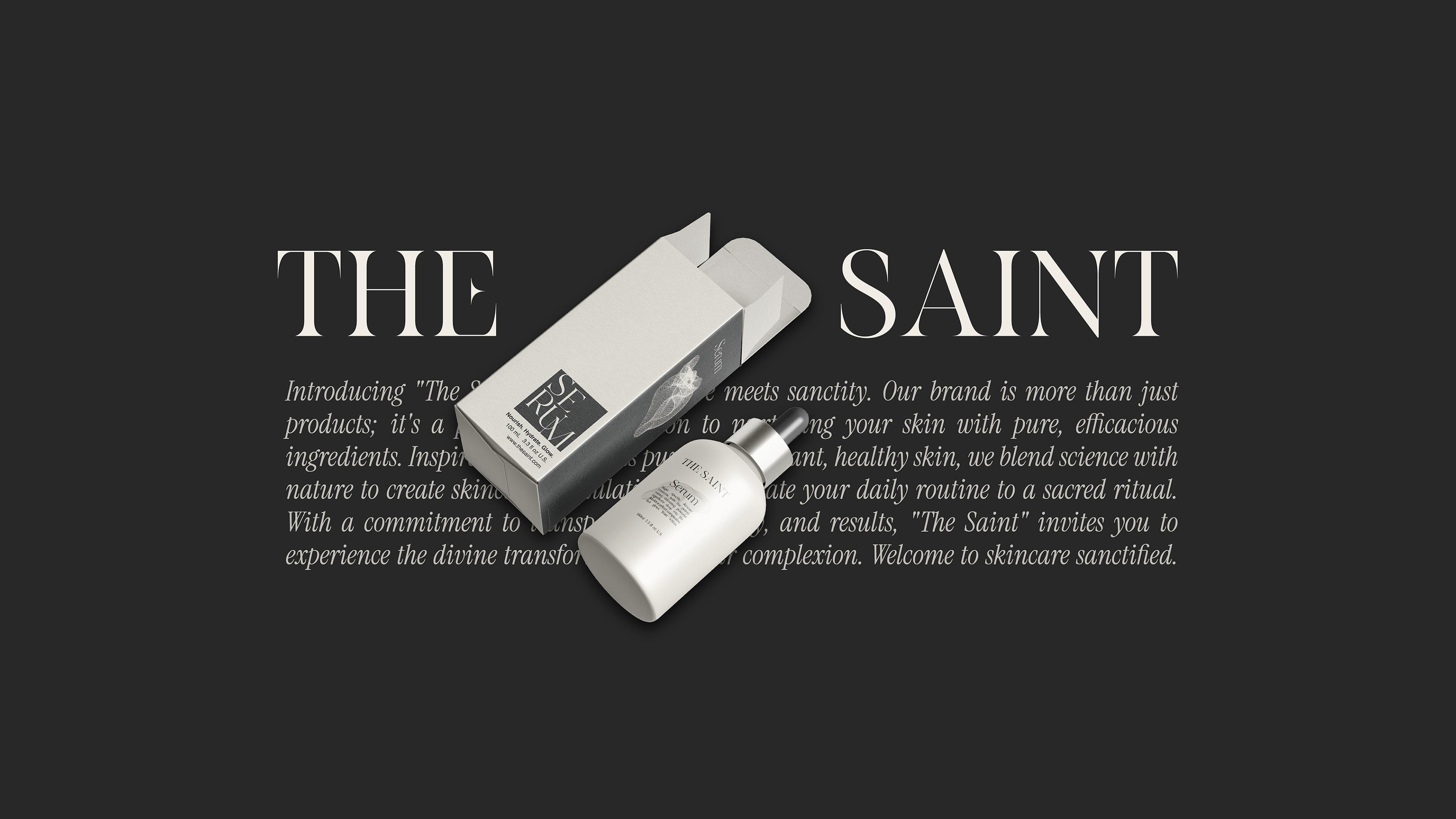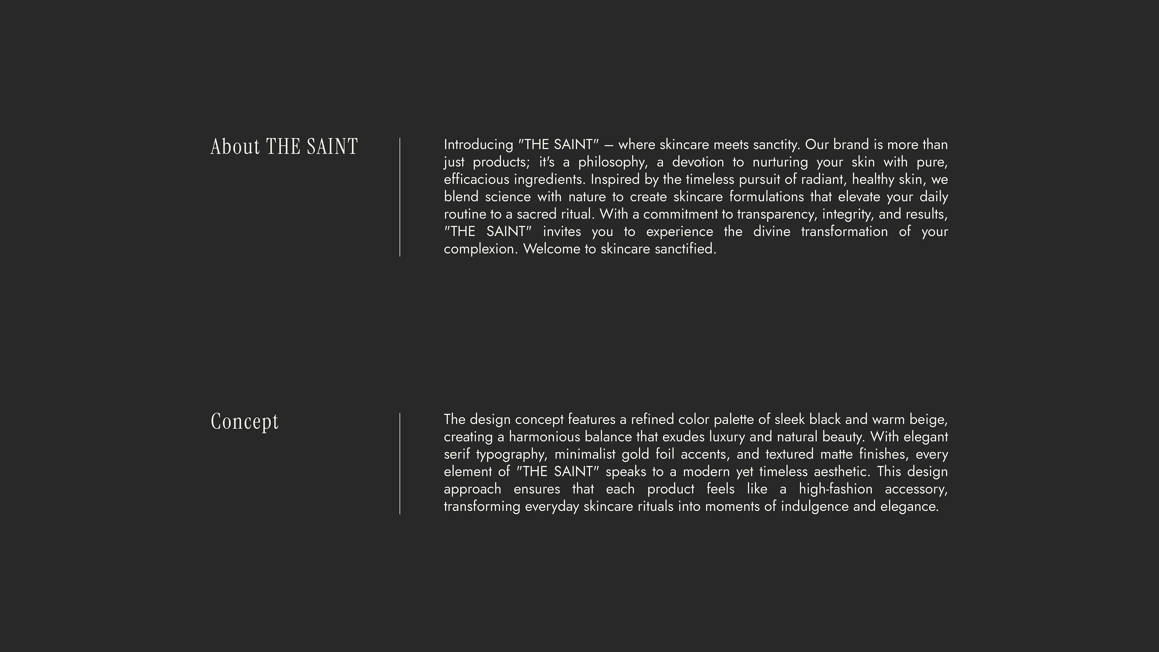 The design concept features a refined color palette of sleek black and warm beige, creating a harmonious balance that exudes luxury and natural beauty. With elegant serif typography, minimalist gold foil accents, and textured matte finishes, every element of "THE SAINT" speaks to a modern yet timeless aesthetic.