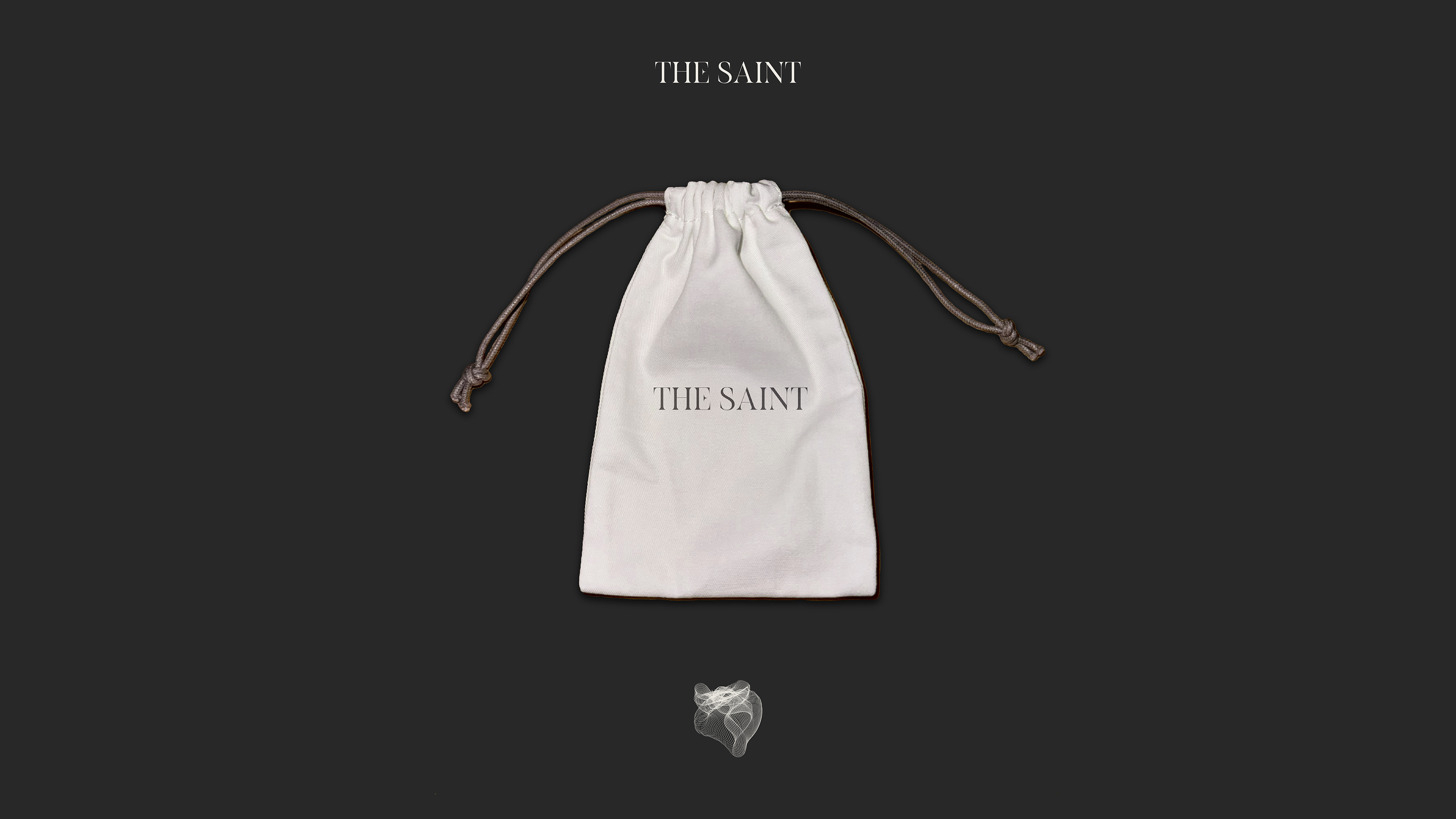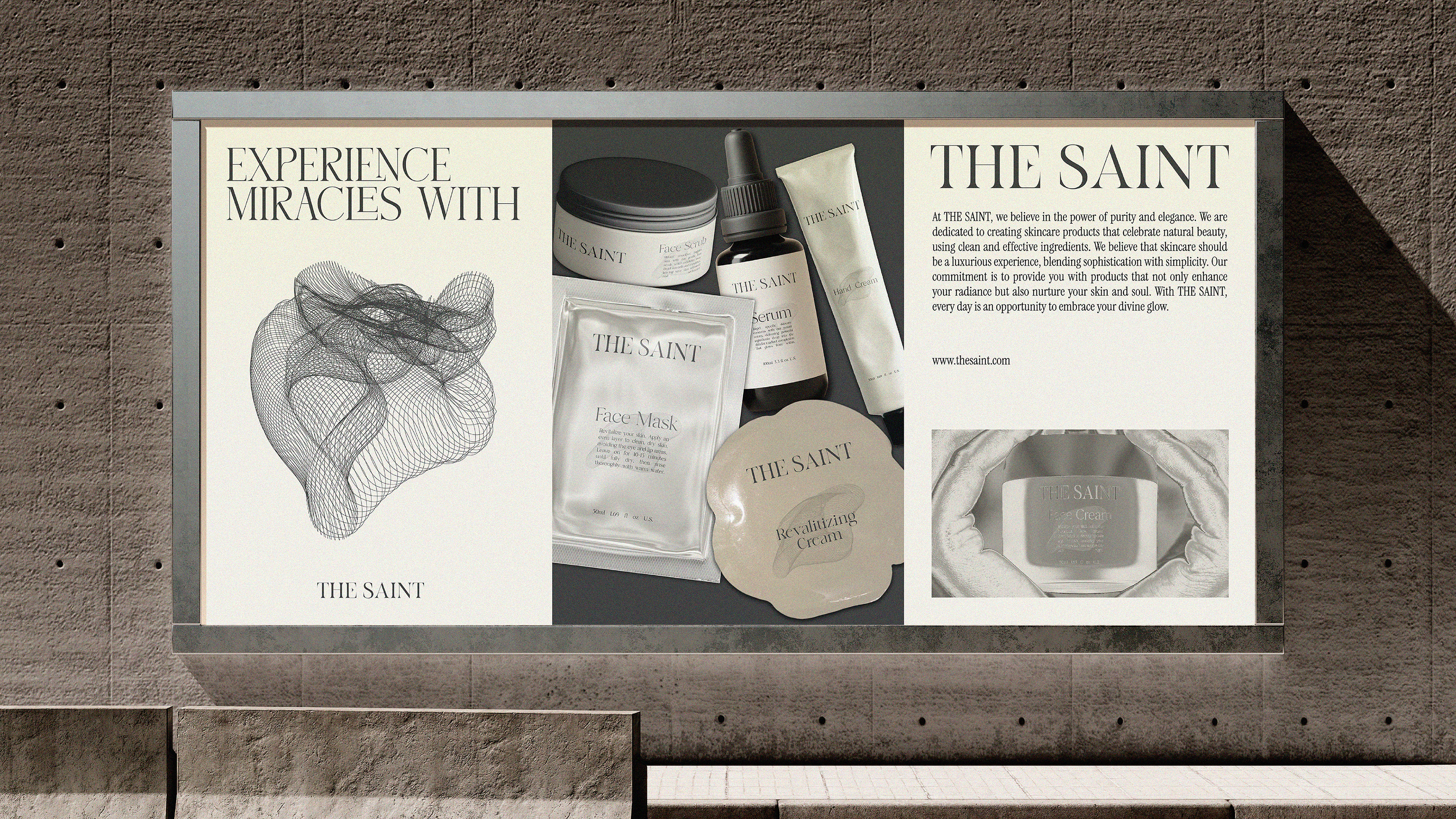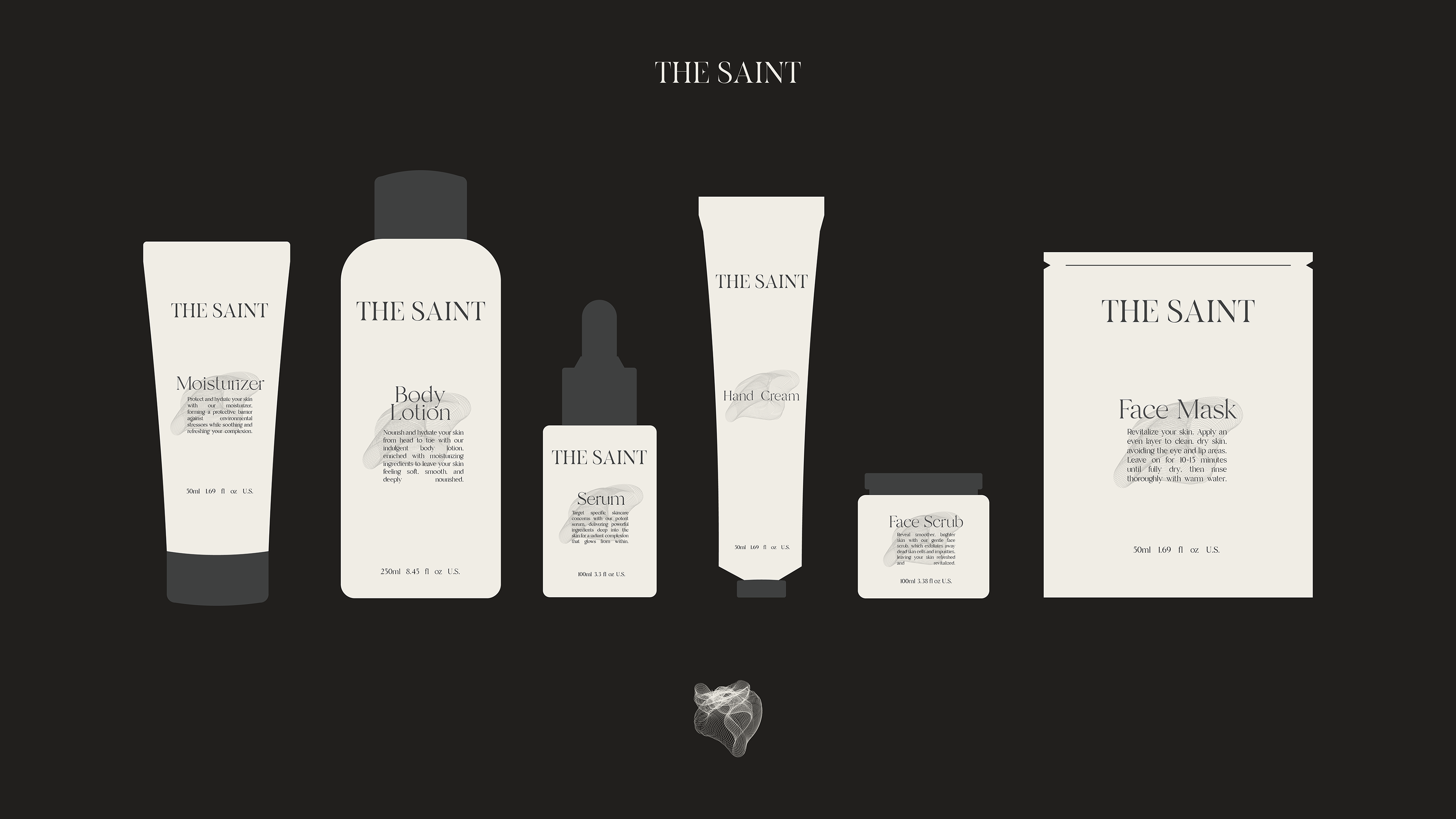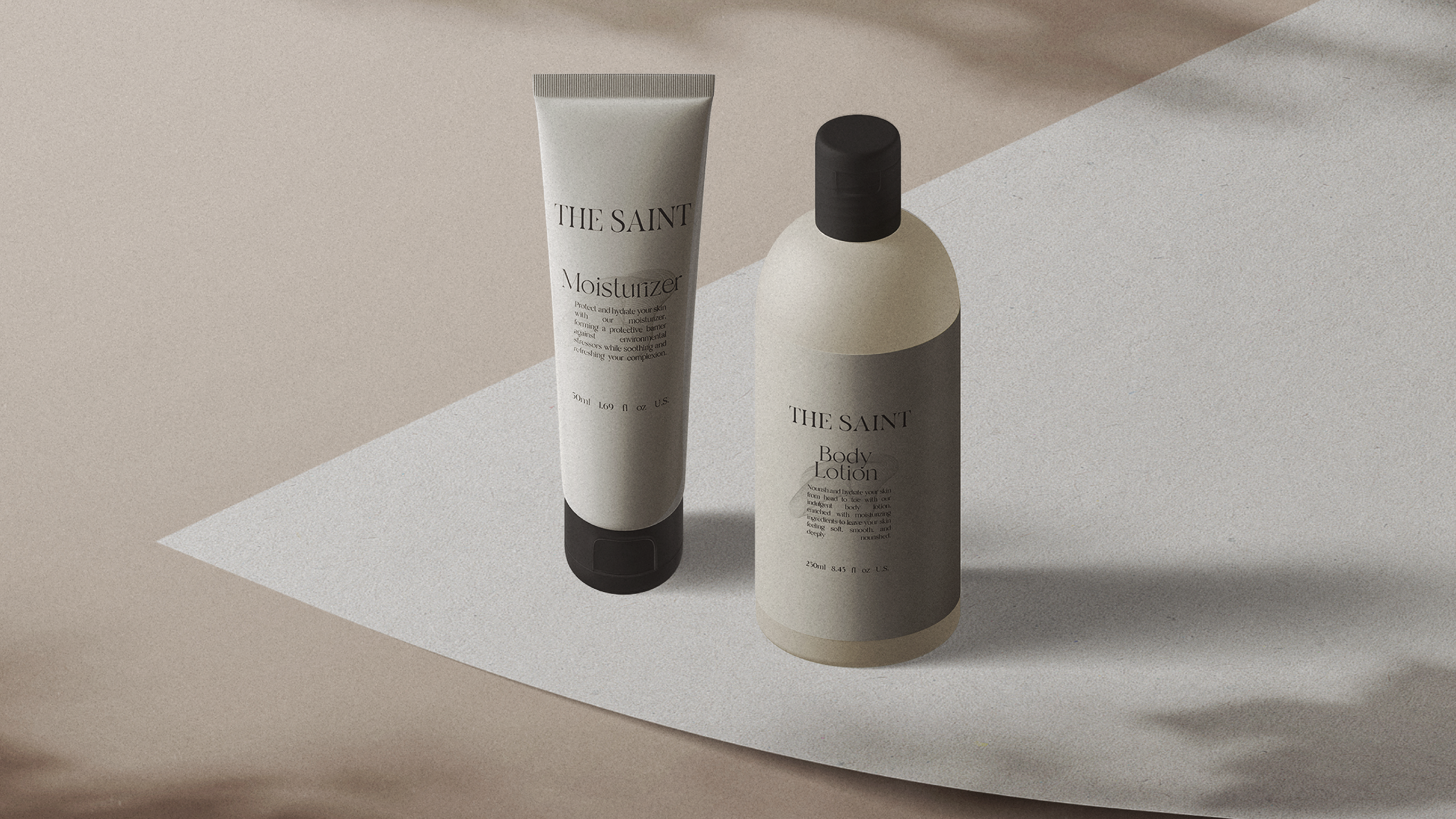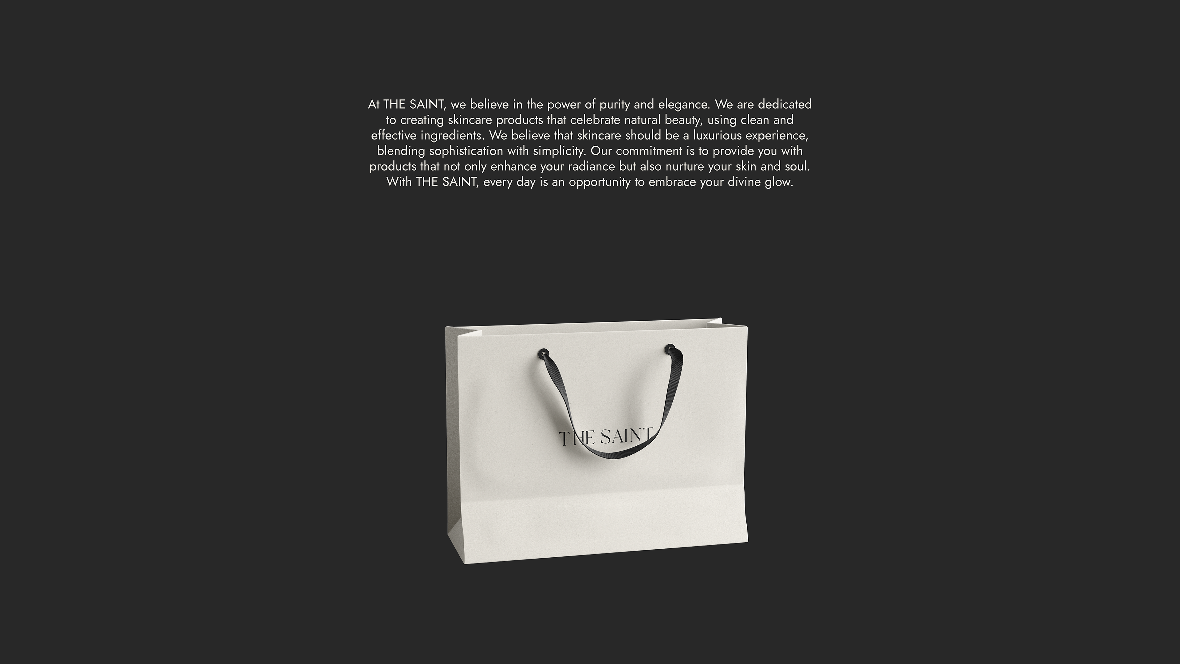 The design concept features a refined color palette of sleek black and warm beige, creating a harmonious balance that exudes luxury and natural beauty. With elegant serif typography, minimalist gold foil accents, and textured matte finishes, every element of "THE SAINT" speaks to a modern yet timeless aesthetic.