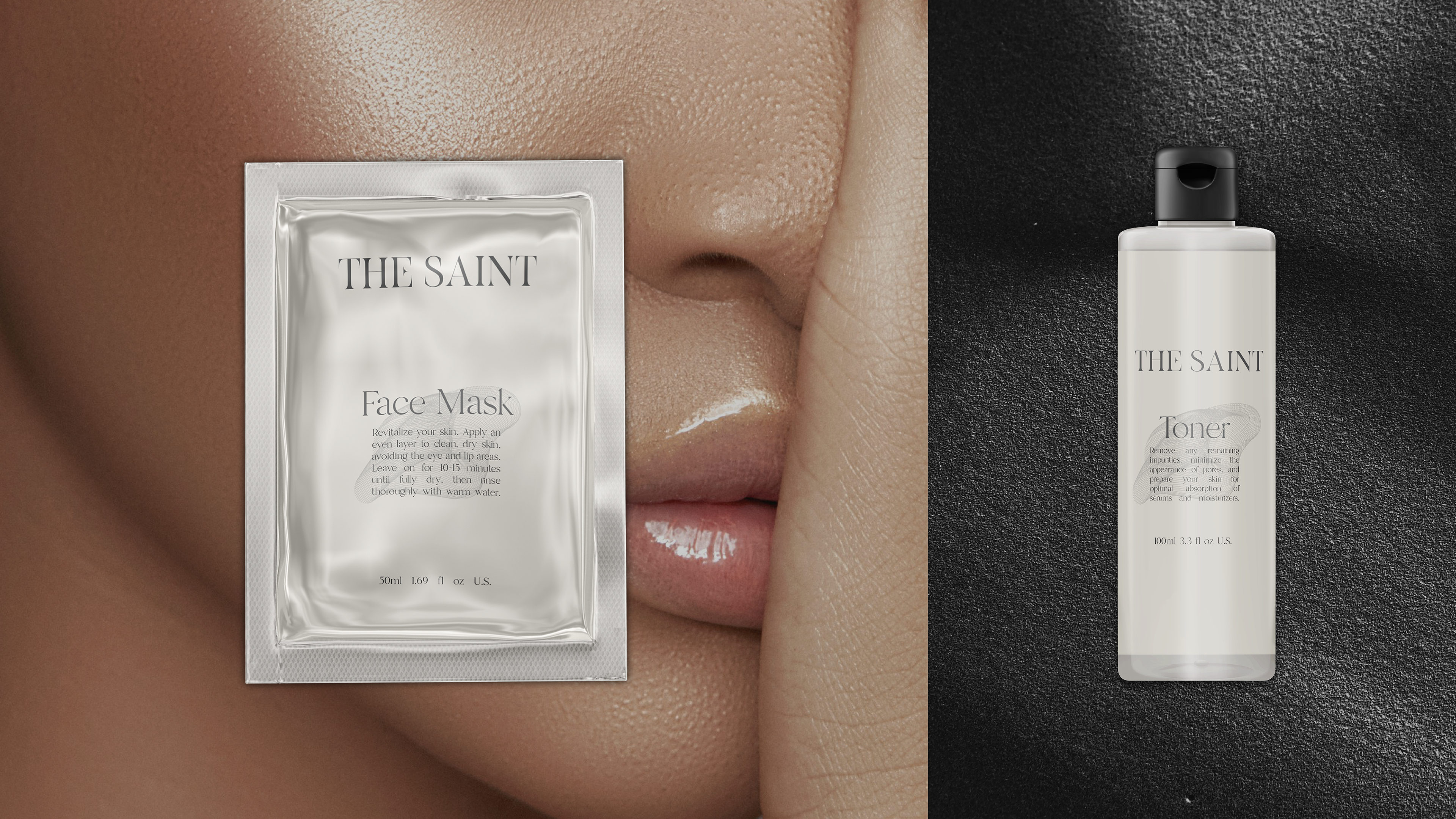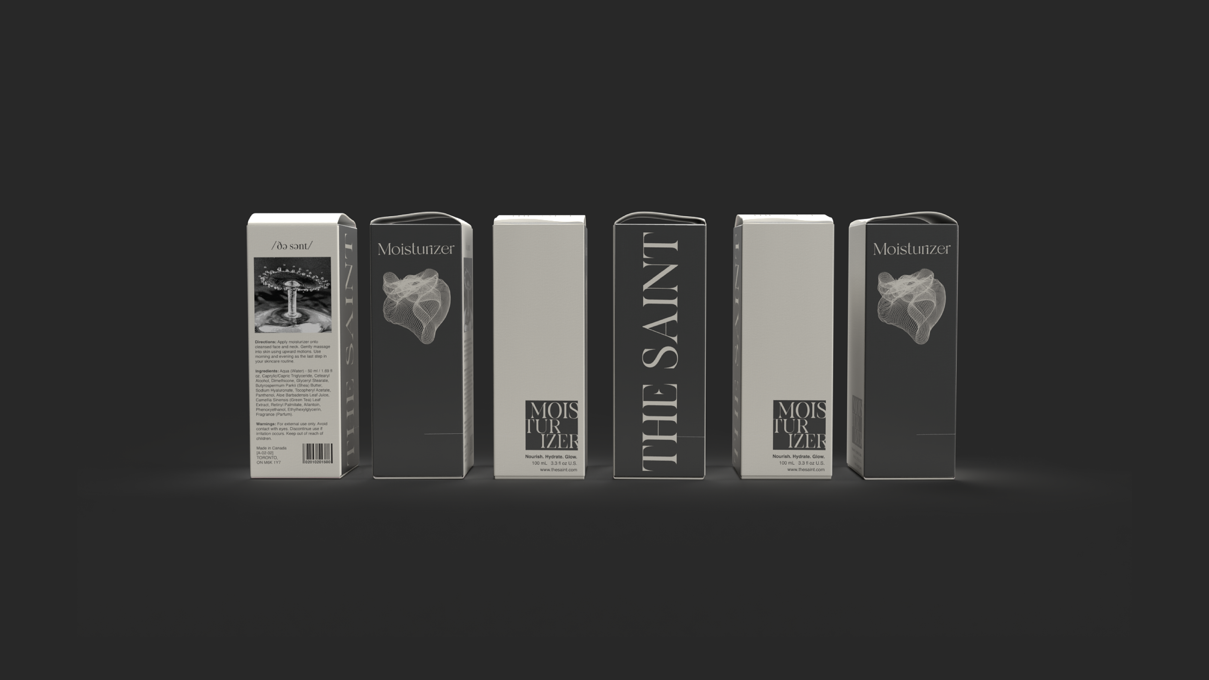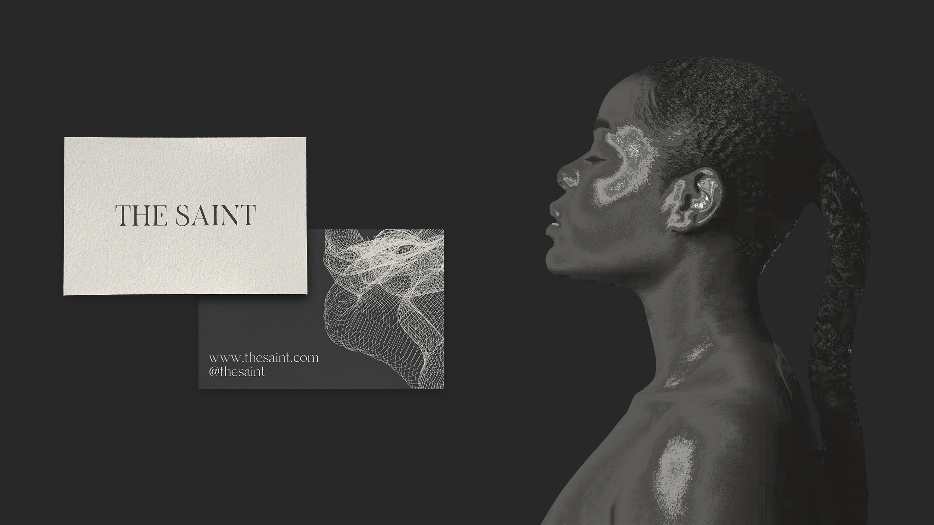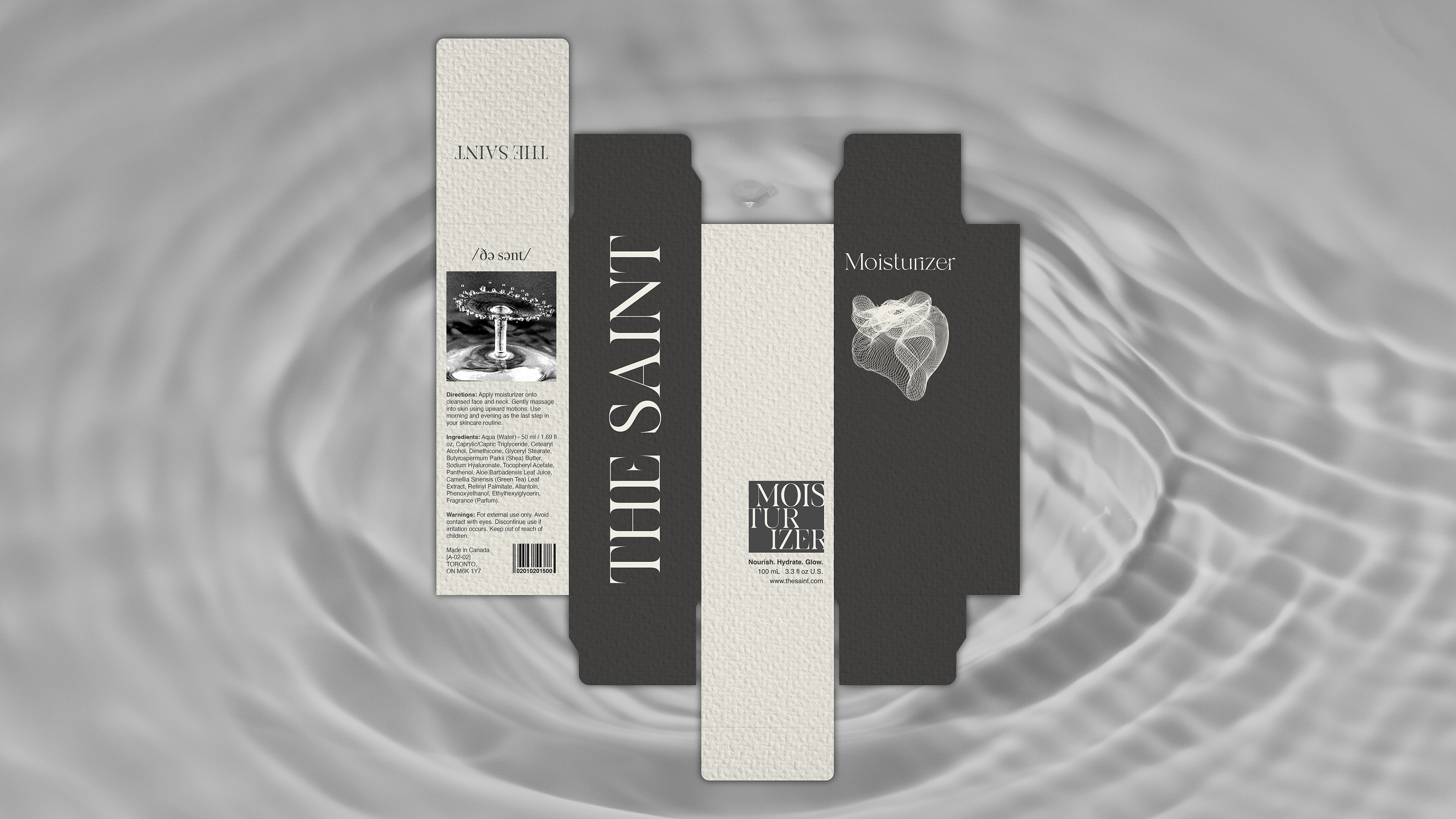 The design concept features a refined color palette of sleek black and warm beige, creating a harmonious balance that exudes luxury and natural beauty. With elegant serif typography, minimalist gold foil accents, and textured matte finishes, every element of "THE SAINT" speaks to a modern yet timeless aesthetic.
